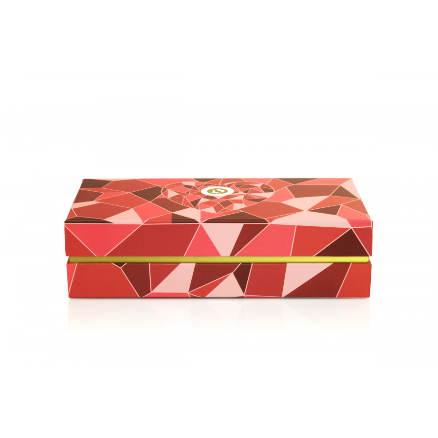 Planète Chocolat ha deseado proponer un cofre de lujo y romántico destinado a los enamorados con el fin de permitirles morder su pasión en una nueva selección de 17 bocados sabiamente elaborados. La caja rectangular, decorada con un corazón y de motivos geométricos en tonalidades rojas y rosas, encierra tres filas con seis corazones de chocolate. Cada uno de ellos es cuidadosamente depositado en una cavidad que protege todo el aroma de los granos de cacao que componen la receta de estos dulces de San Valentín. Jengibre, frambuesa, tiramisú, menta, rosa, pistacho, cacao o café: estos pralinés con ganache de sabores variados son igualmente delicadamente estilizados a mano, para hacerlos únicos tanto en los visual como en su sabor.
