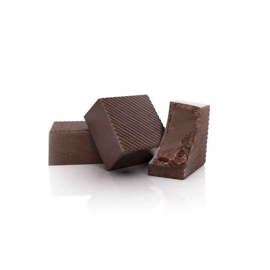 Le fourrage à la pâte de noisettes dense présente des saveurs sucrées et moelleuses rappelant agréablement le miel et les fleurs d’acacia. Il est sublimé par un enrobage de chocolat fondant. Le motif de la praline est caractérisé par la perfection et l’exact espace entre chaque ligne.