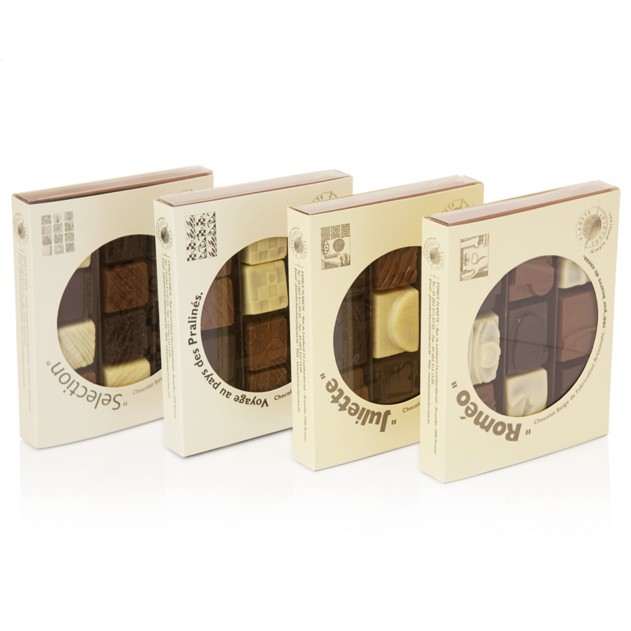 Cacaomassa, cacaoboter, volle melkpoeder, glucose, verse room, sinaasappelpasta, karamel, pure chocolade, gianduja (hazelnootpasta, melkchocolade) honing, praline (hazelnootpasta), amandelpasta met koffie, amaretto, citroenpasta, truffelolie, fijn gehakte noten, nootmuskaat, bruine suiker, kaneel, speculoos, natuurlijke koffie aroma, cognac, kastanjehoning, suiker, emulgator: sojalecithine (zonder GGO), aroma: natuurlijke vanille.